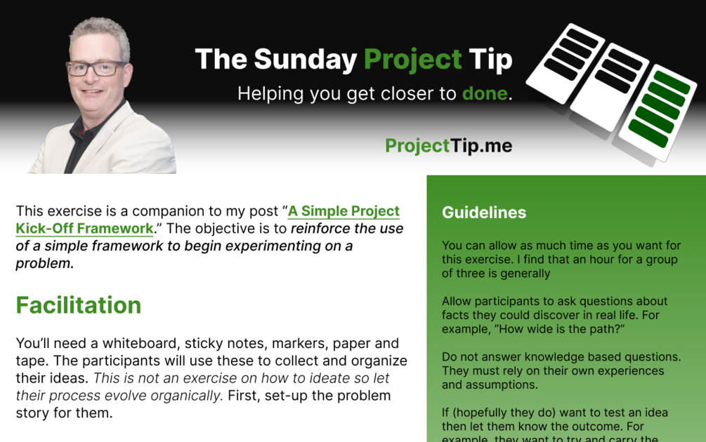 This exercise is a companion to my post “A Simple Project Kick-Off Framework.” The objective is to reinforce the use of a simple framework to begin experimenting on a problem.